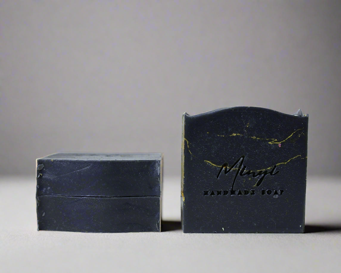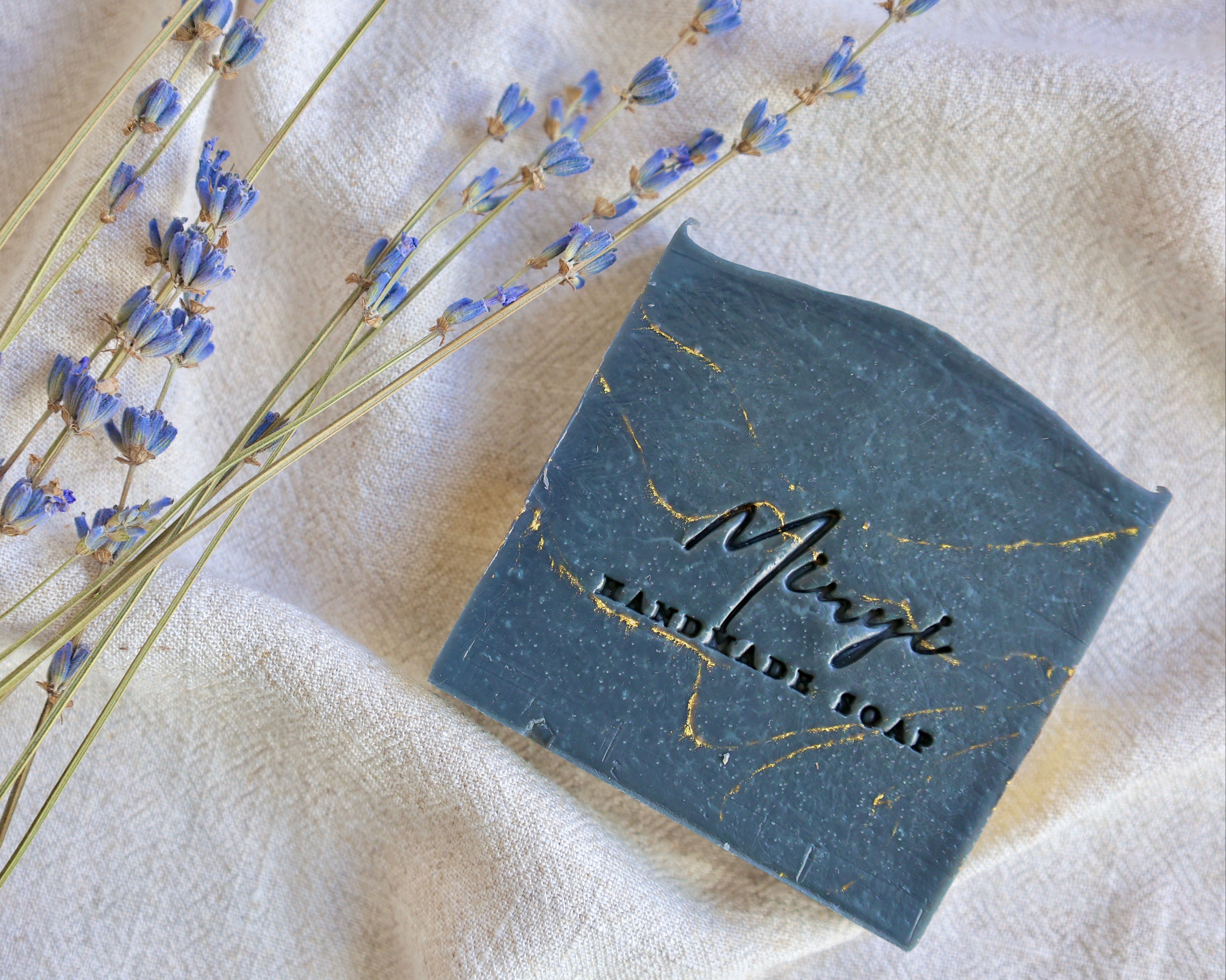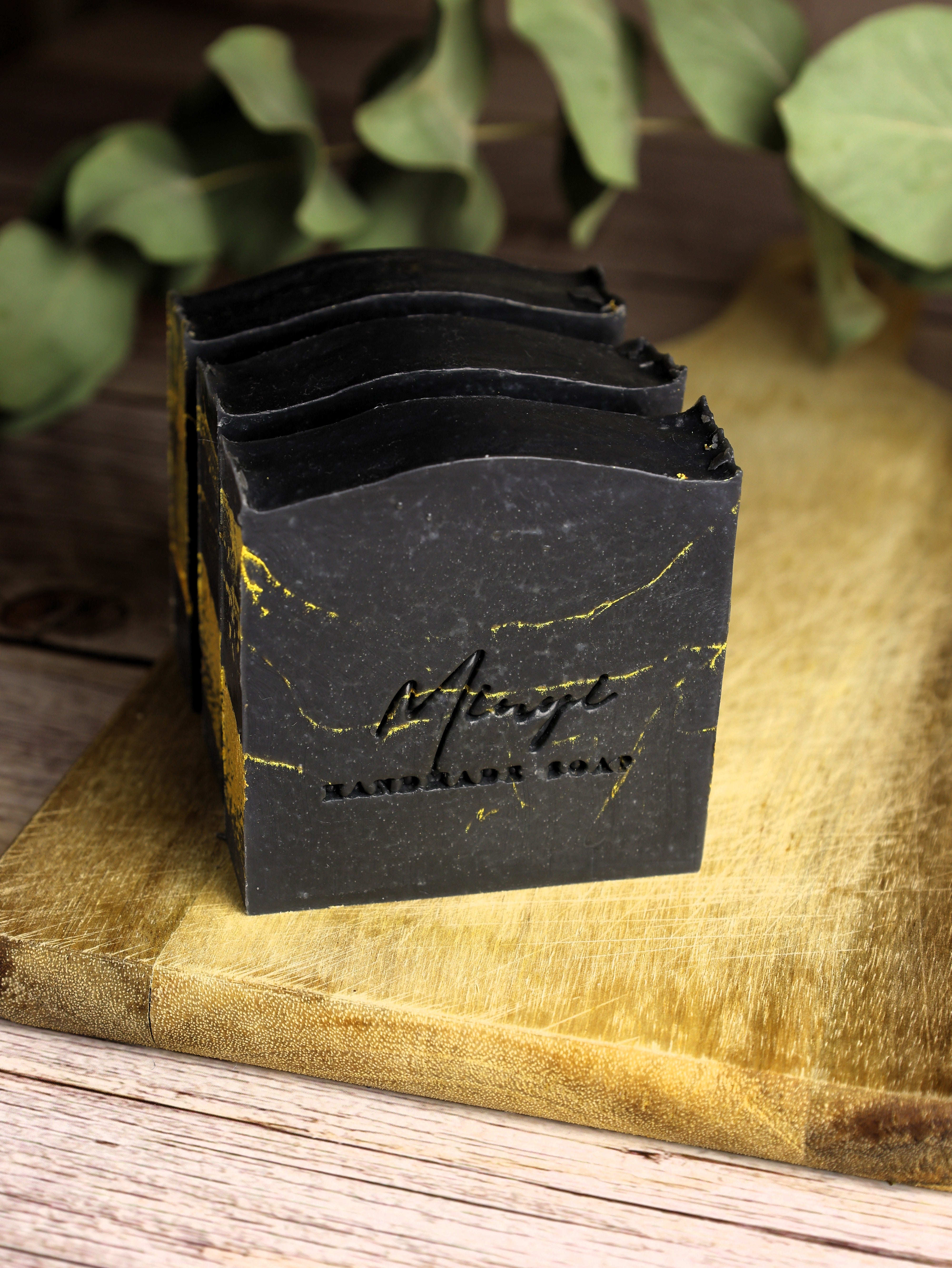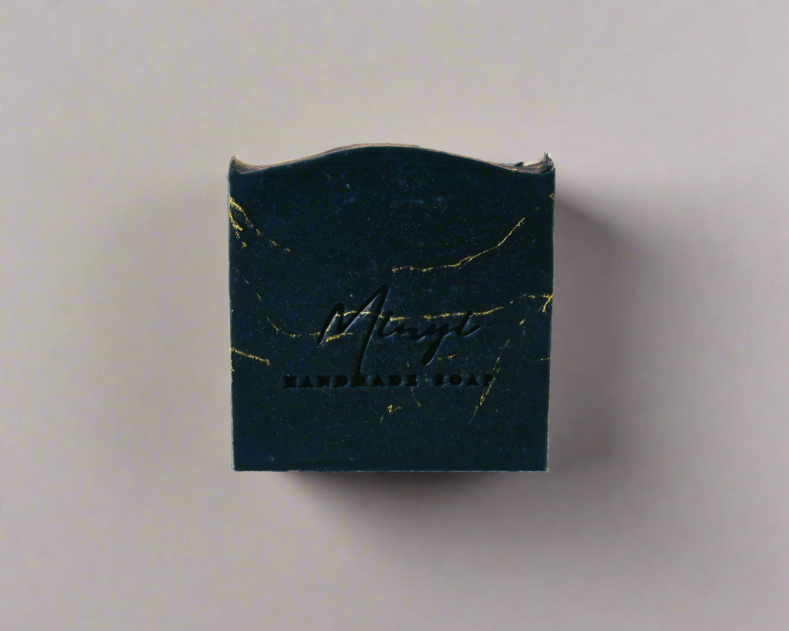 Inside the soap, you’ll find a hint of gold shimmer. It comes from eco-friendly glitter, made from plant material and safe for skin. The gold lines run through the dark soap, creating a soft and elegant contrast.