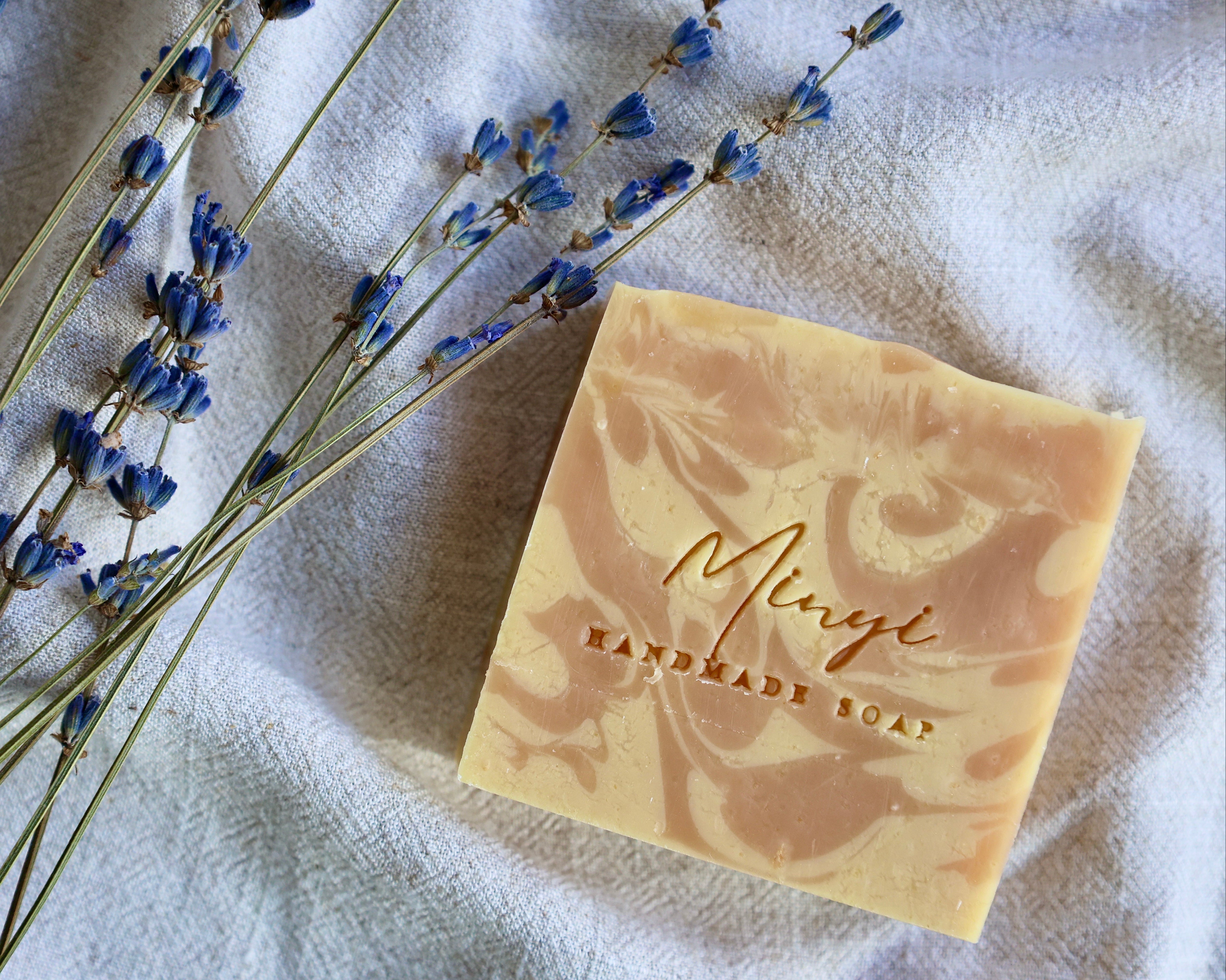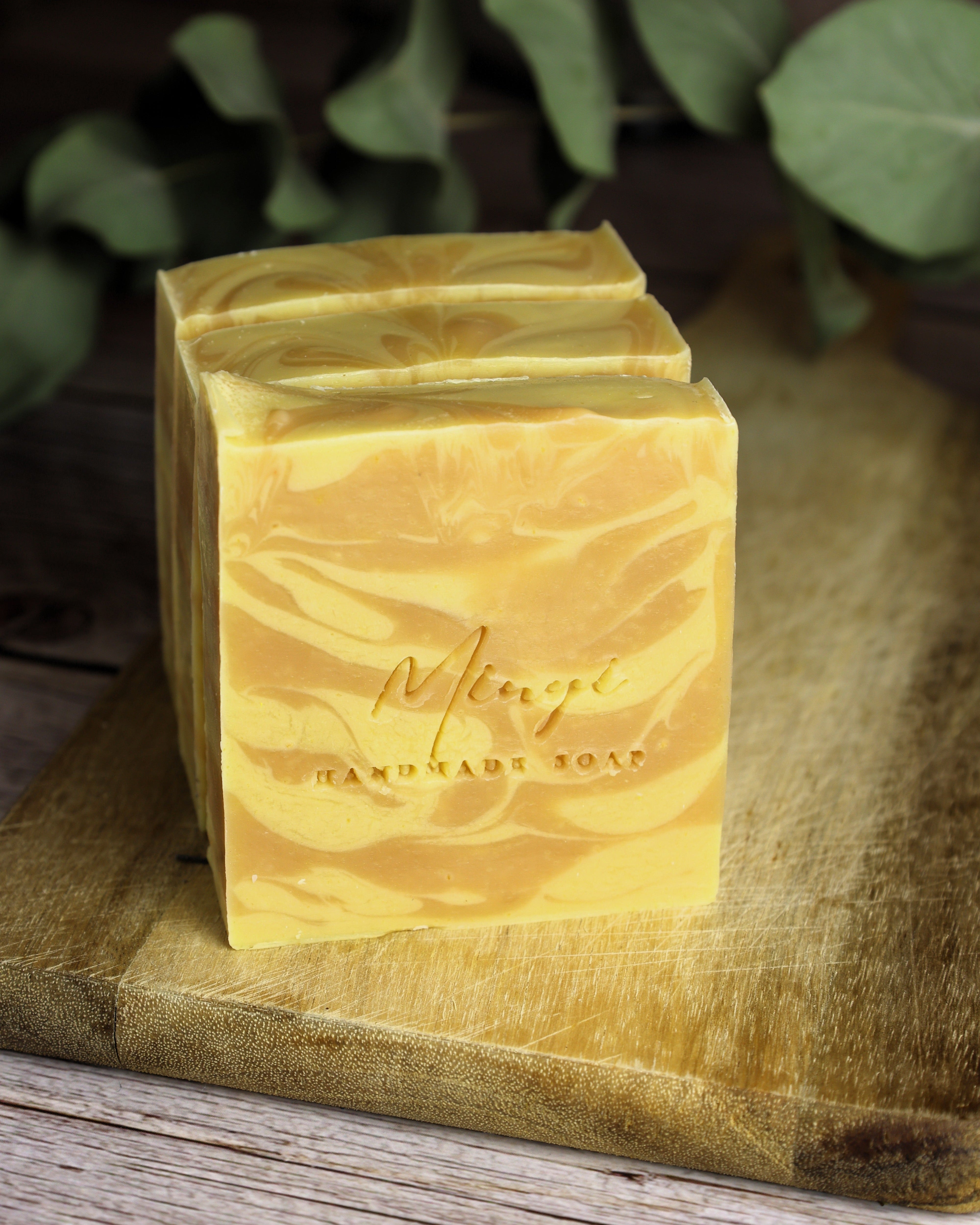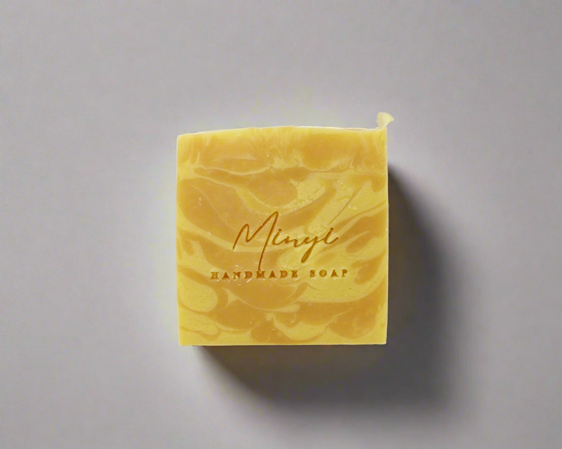 This cold process soap is handmade in small batches using olive oil, rapeseed oil, coconut oil, and castor oil. Instead of plain water, we use a blend of fresh ginger juice and orange peel juice as the liquid phase. This adds a natural touch and gives the soap a warm, golden base.