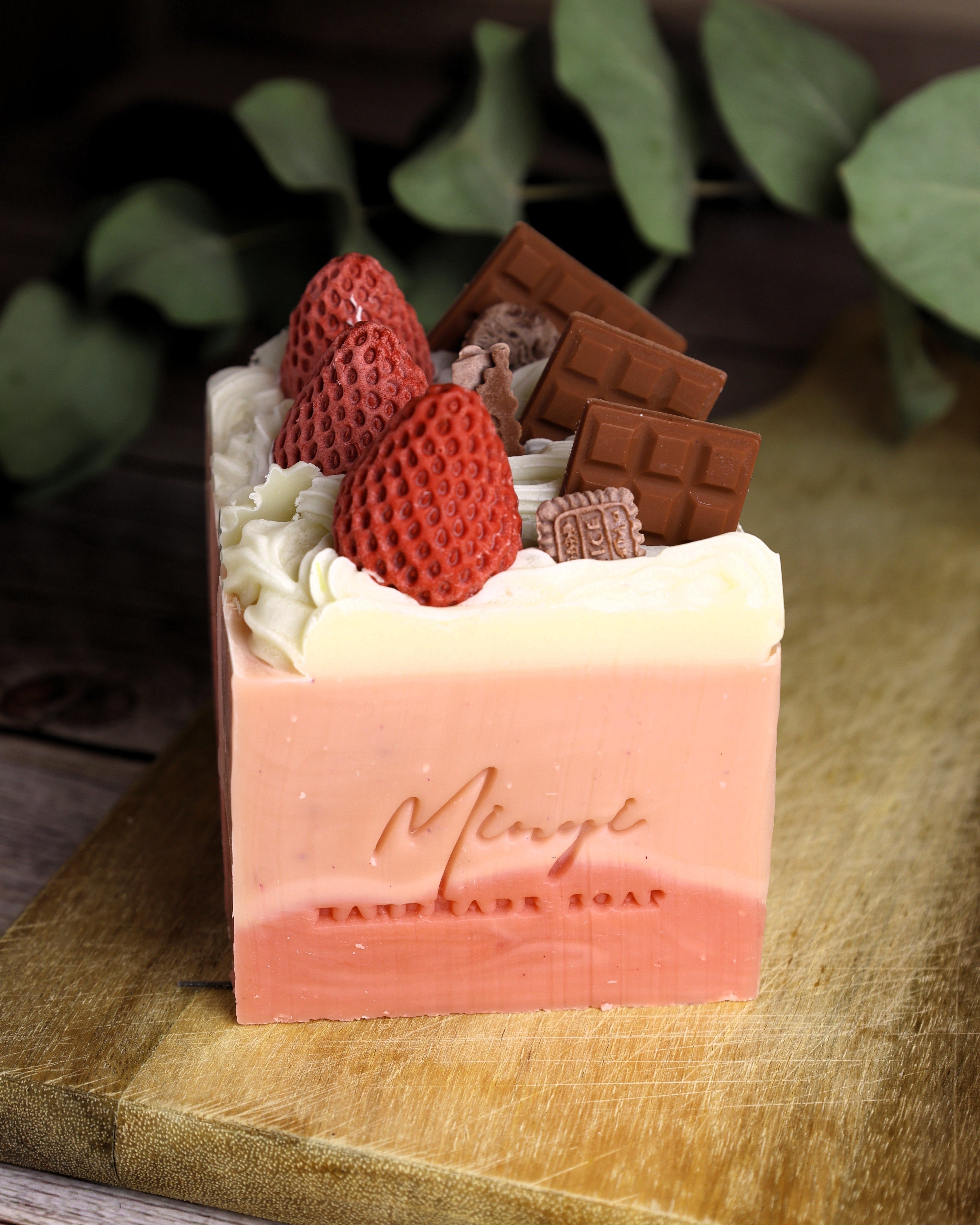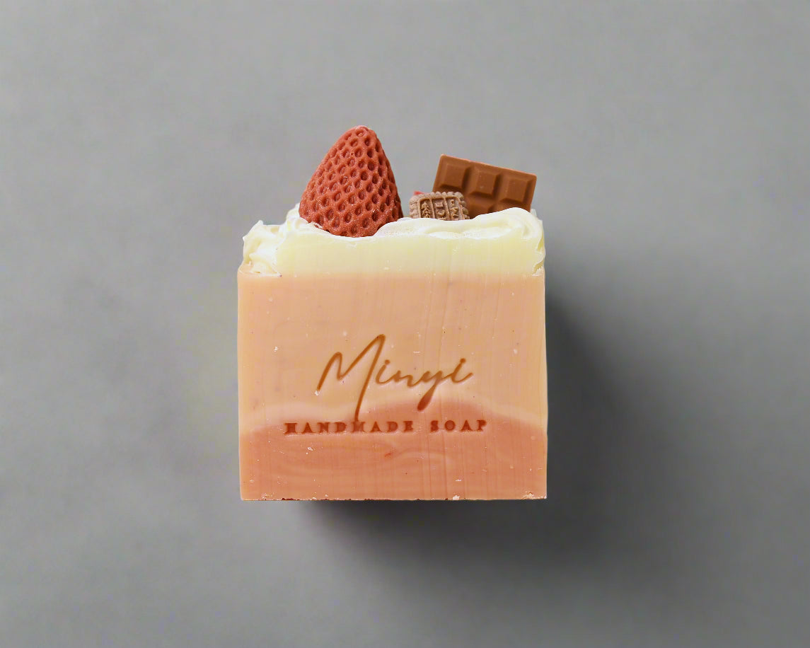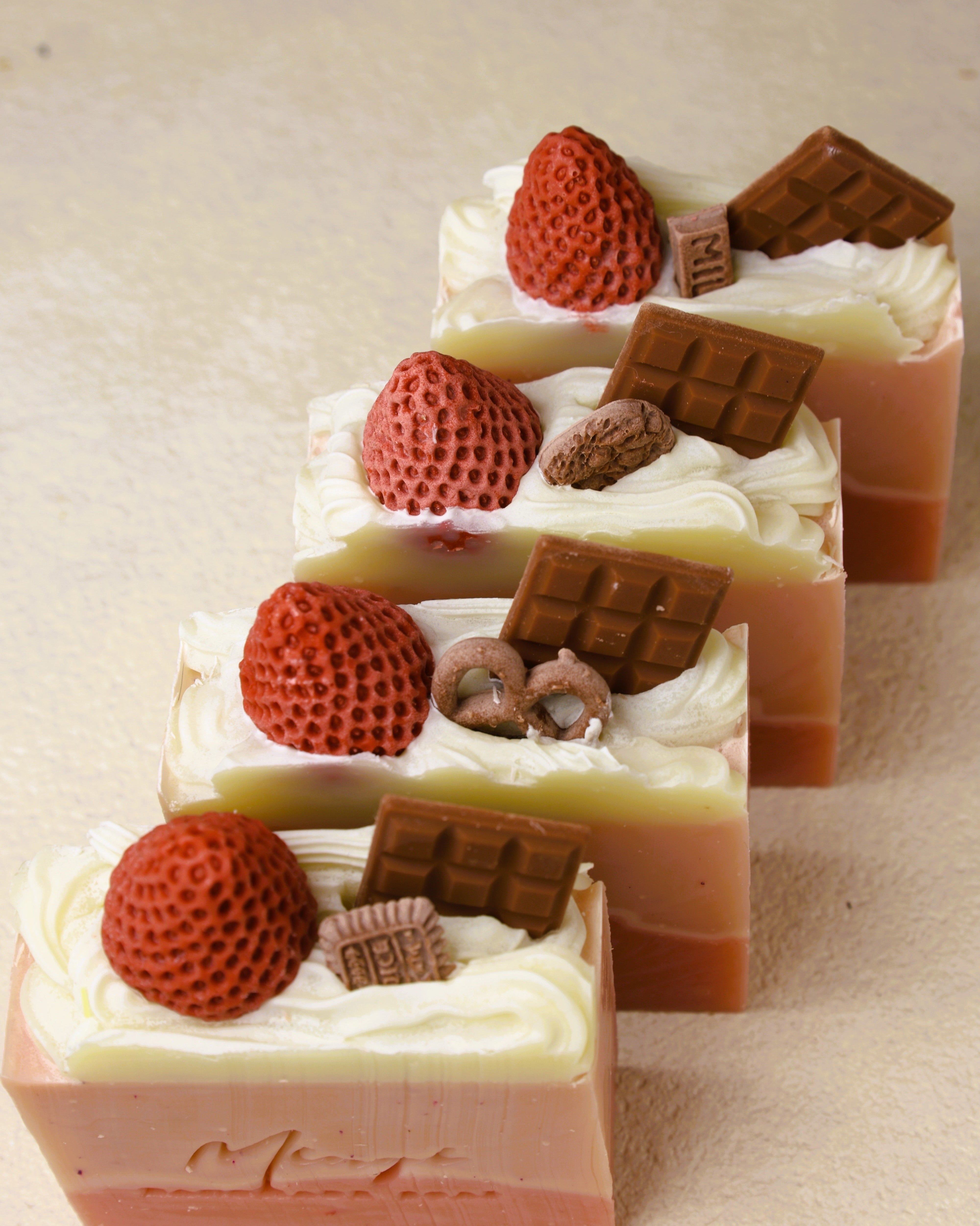 The layers are coloured with a mix of Trial by Fire Red mica, brown iron oxide, and green chromium oxide — all approved for cosmetics. On top, we pipe a whipped soap “cream” and decorate each bar with soap-made strawberries and chocolates.